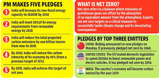 इसके अलावा, भारत ने एक पाँच-सूत्री कार्ययोजना के अंग के रूप में वर्ष 2070 तक कार्बन तटस्थता प्राप्त कर लेने की घोषणा की है, जिसमें वर्ष 2030 तक उत्सर्जन को 50% तक कम कर लेना भी शामिल है। भारत की विकास आवश्यकताओं के हित में इस निर्णय का विश्लेषण किये जाने की आवश्यकता है।